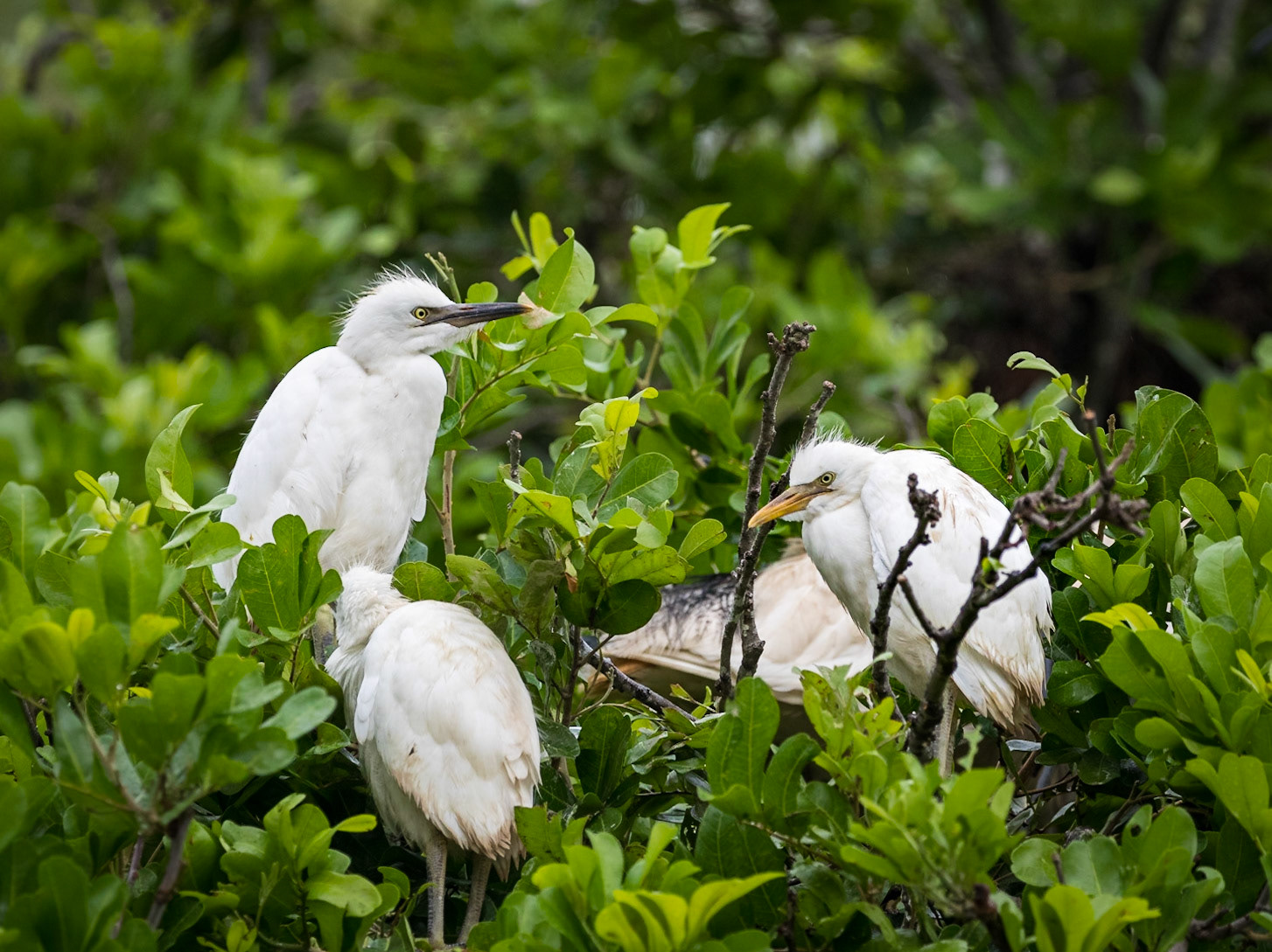 Sparring cattle egret chicks, in the nest waiting for their next feed.